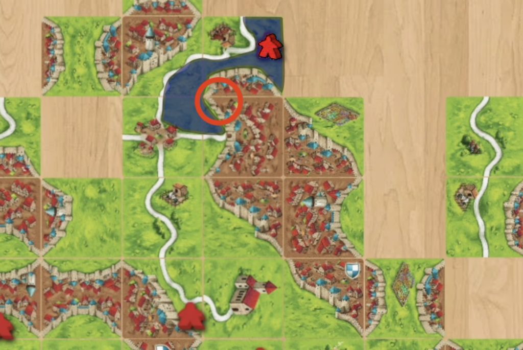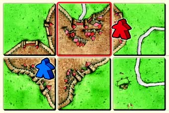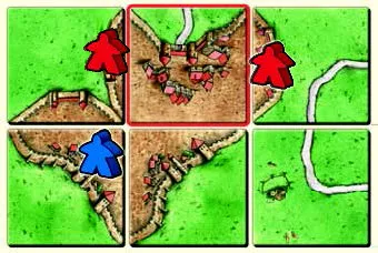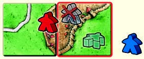 しかし、接続したタイルの都市のエリアに赤プレイヤーのコマが既にある為、青プレイヤーは都市にコマを配置できません。草原にコマを寝かせることは出来ます。