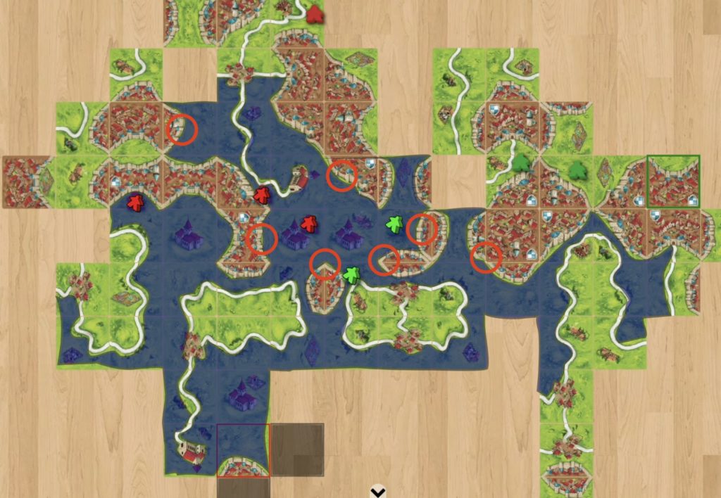 手持ちのコマは7個しかありません。 大きな都市や長い道路を作ろうとして、完成しない場所にコマを置き続けると、すぐに手元のコマがなくなってしまいます。 常に2〜3個は手元に残しておくように意識し、こまめに点数を確定させて回収しましょう。