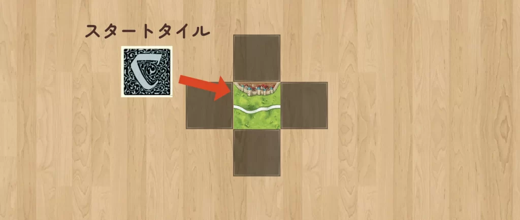 地形タイルの中から、裏面が黒っぽくなっている「スタートタイル」を1枚探し出し、テーブルの中央に表向きで置きます。