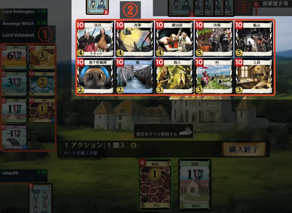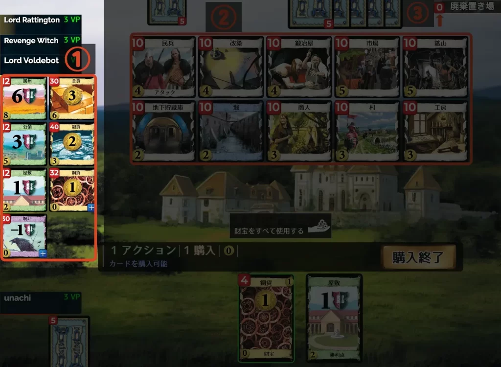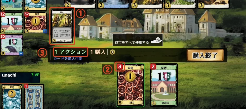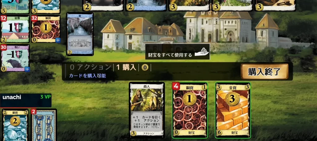 - 「+1 購入」の効果: アクションカードなどでこの効果を得ていれば、複数のカードを購入できます。