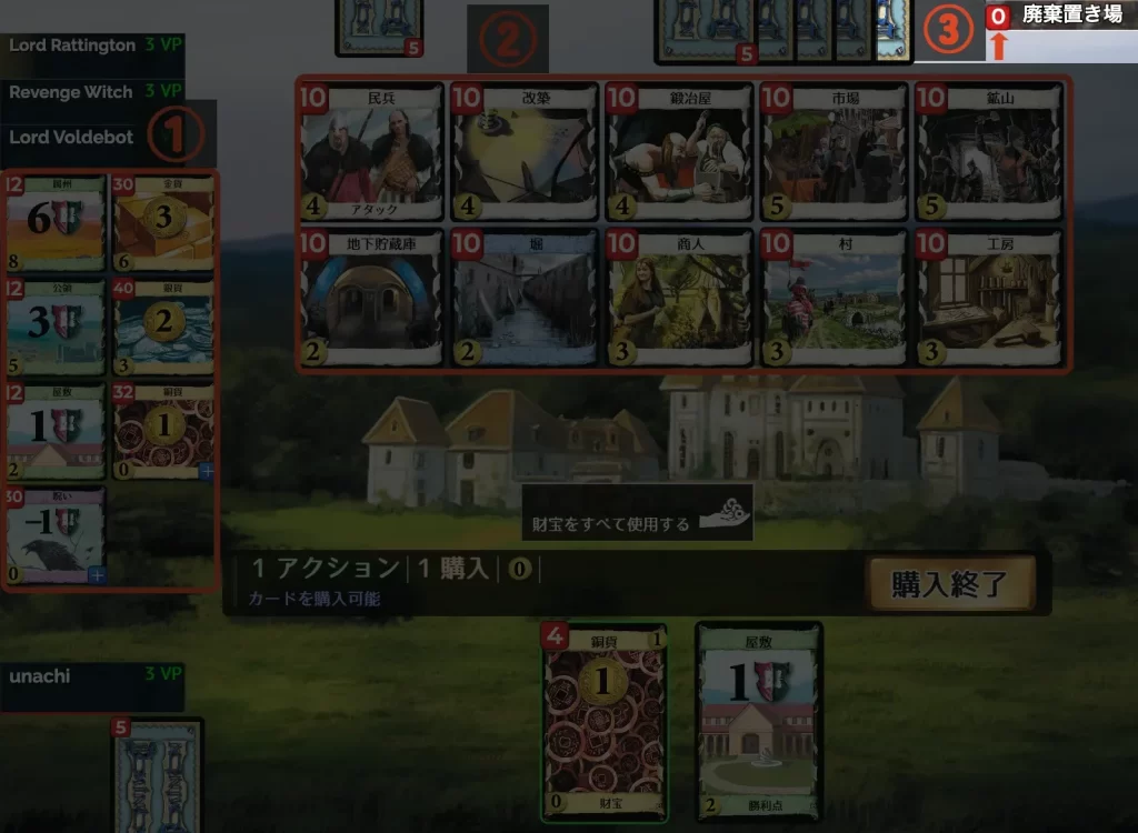 初期デッキに入っている「銅貨」や「屋敷」は、後半になると弱くて邪魔になります。これらを「廃棄」することで、デッキの中身が「銀貨・金貨・強いアクション」だけになり、毎回最強の手札が来るようになります。 - 「カードを捨てるなんてもったいない!」と思うかもしれませんが、これが脱・初心者の第一歩です。