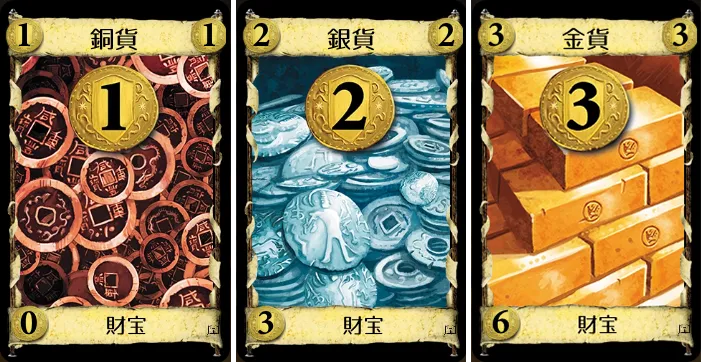 - 基本財宝カード:銅貨(60枚)、銀貨(40枚)、金貨(30枚)
