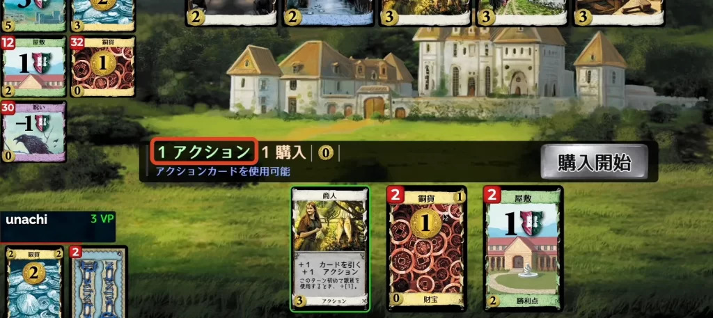 「屋敷」や「公領」は、勝利に必要な特典カードですが、ゲーム中は何の効果も生まない「お荷物」です。序盤にこれらを買うと、手札が事故りやすくなります。 - アクションカードを買いすぎる