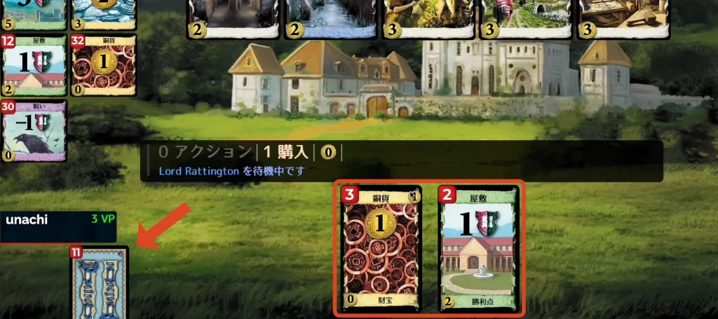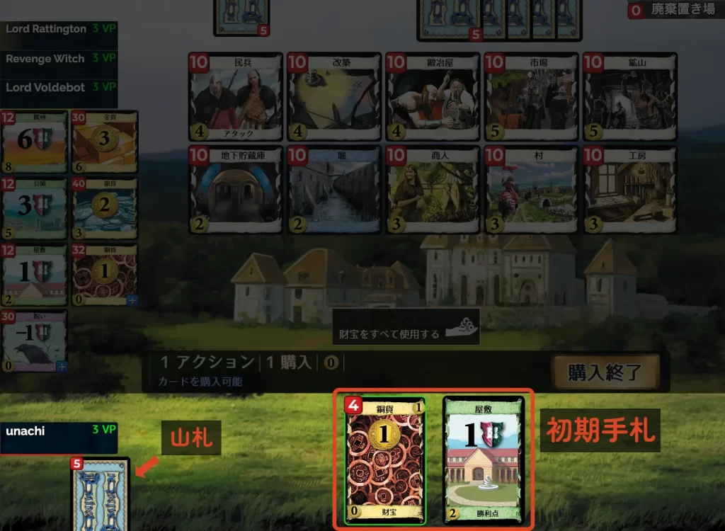 サプライから新しいカードを購入し、デッキを強化します。
